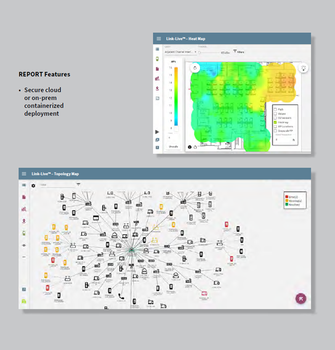 Reporting is easy using the Link-Live collaboration platform with features including results comparisons, discovery snapshots, and heat and topology maps. Link-Live provides organization-wide management of all NetAlly analyzers and results via secure cloud.