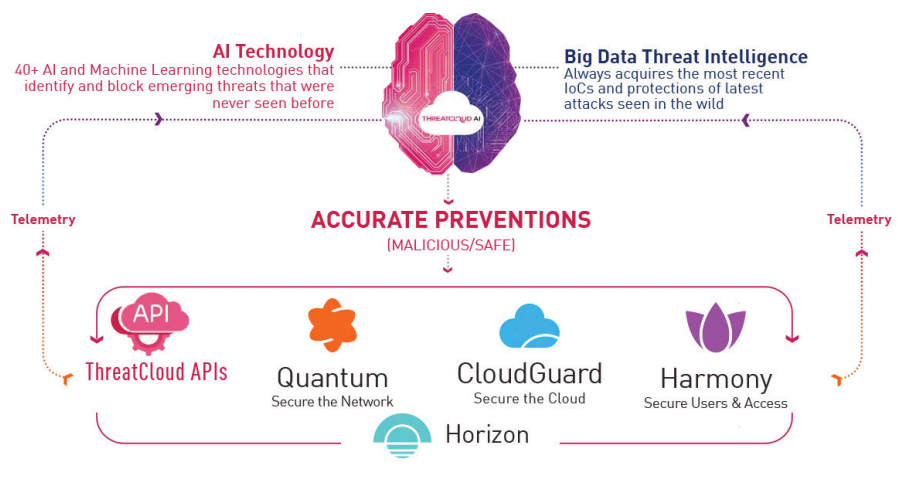 When customers use Check Point to secure their business, they gain accurate prevention against the most advanced attacks through the power of ThreatCloud AI. ThreatCloud AI combines the latest AI technologies with big data threat intelligence to prevent the most advanced attacks while reducing false positives, keeping businesses safe and productive.